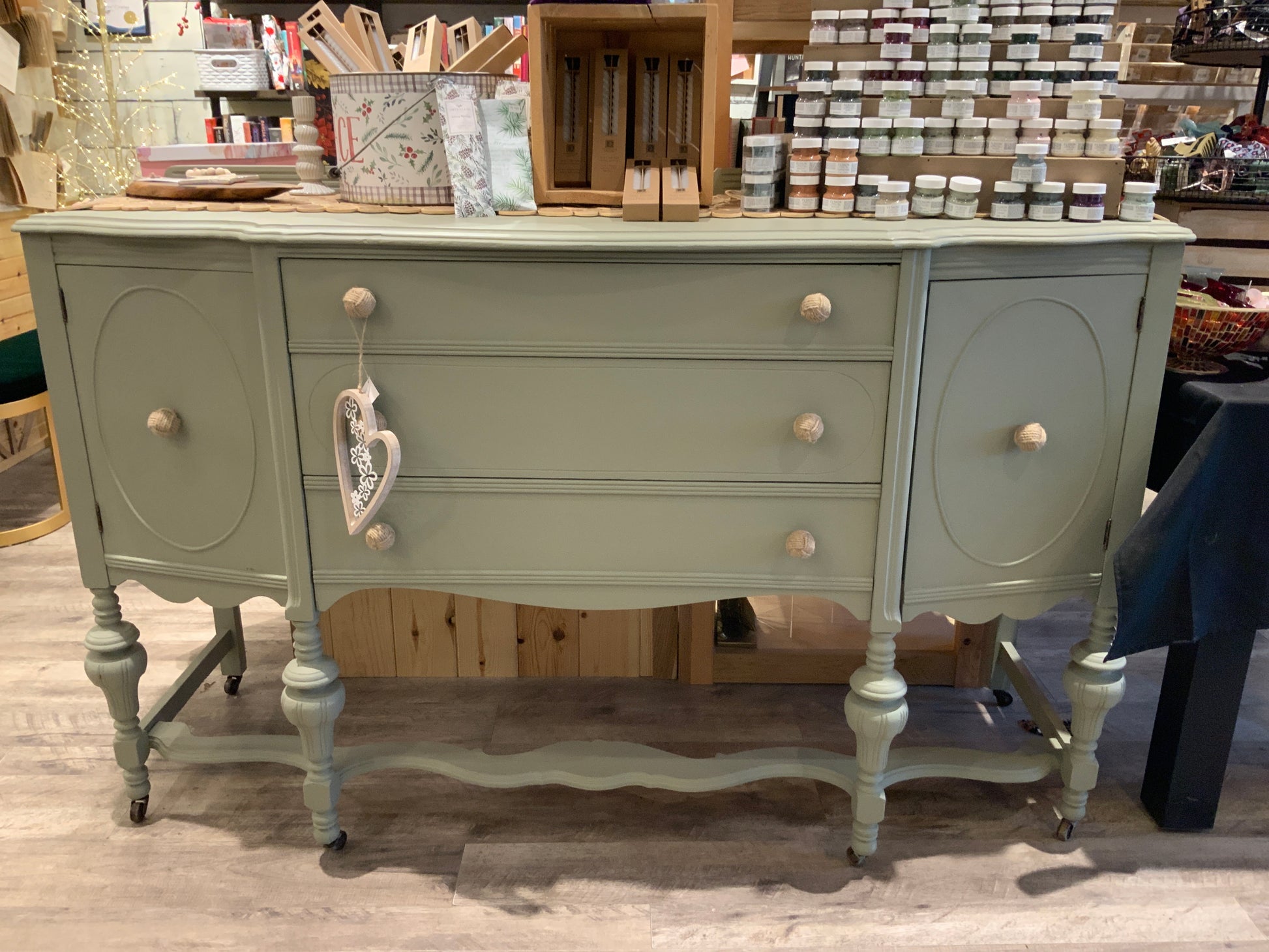 This beautiful Buffet was painted in a lovely soft green (custom blend) painted with fusion Mineral Paint. This piece has great storage space, 3 drawers and 2 cabinet doors. On casters for easy moment.